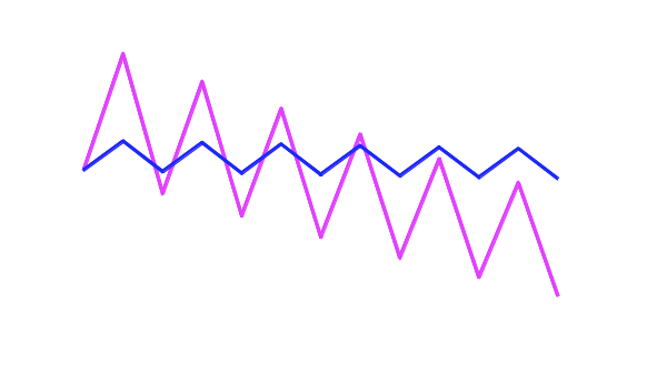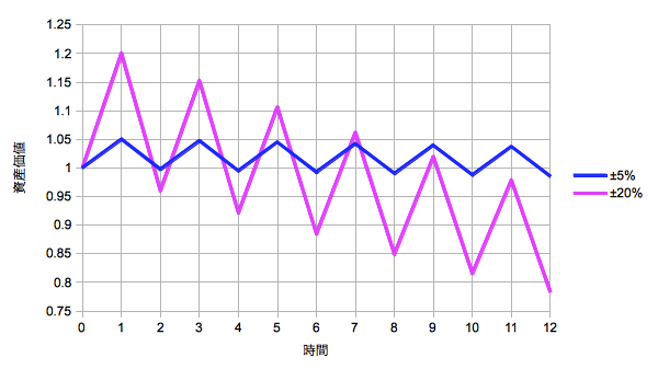 青い線は初期値を1として×1.05(+5%)、×0.95(-5%)を交互に掛け算したもの、赤い線は同じく×1.2(+20%)、×0.8(-20%)としたものです。