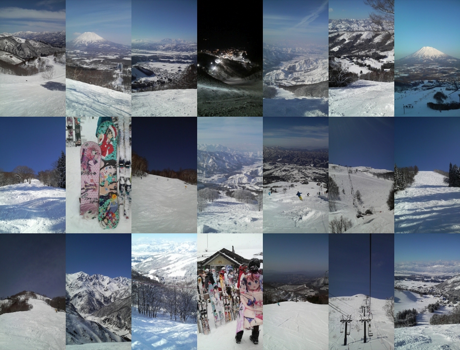 せっかくなので今シーズンブログに貼った画像を一枚絵にしてみました。今年はあんまりスキーがうまくならなかったですけど、「雪山タイルs 2015」みたいなものができたということでよしとしたいと思います。(16:9の画像を縦横混在で敷き詰めるのは困難だったのでカメラの横位置と縦位置で別に作っています。順序は乱数を振ってシャッフルしています。)