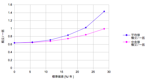 主要な演算結果である①「積立/一括」の平均値と中央値、②「積立/一括」の所定値に対する確率分布、③一括と積立の象限確率(積立マジックマトリクス)について、横軸を標準偏差としてプロットします。