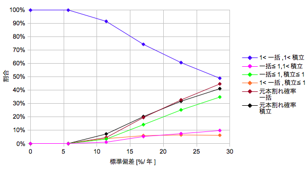 まずシグマが大きいほど一括と積立との差が小さくなる点が重要だと思います。特にシグマが約23%で「積立/一括」の平均値がイーブンになることがわかります(パラメータに依存します)。またおもしろいこととして、シグマが大きいほど「1<積立/一括」および「積立/一括≦0.5」という両端の確率が増加することが挙げられます。このように積立にとってはシグマは比較的よい方向に働くようです。しかし「相乗平均を喰われると元も子も無くしますよ、閣下」。