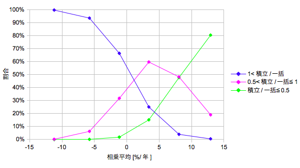 主要な演算結果である①「積立/一括」の平均値と中央値、②「積立/一括」の所定値に対する確率分布、③一括と積立の象限確率(積立マジックマトリクス)について、横軸を相乗平均としてプロットします。