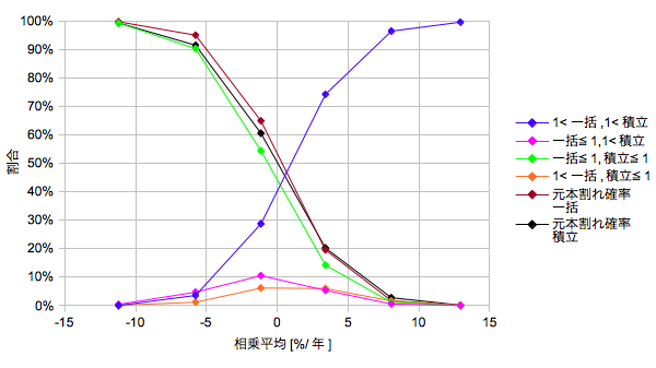 自明な結果だと思いますが、相乗平均リターンが0付近を境に「積立/一括」が逆転することがわかります。相乗平均がマイナスなら一括は高値づかみしたことに相当しますし、プラスなら積立はリスクに晒さなかった代償を受けることになる、と言えるでしょうか。他に特徴としては相乗平均が4%くらいで「1<積立/一括」から「積立/一括≦0.5」に移行する変曲点がありそうだということが挙げられます(パラメータに依存します)。