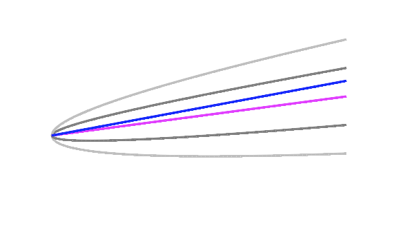 「ポンチ絵」の時にシグマは対数正規分布の平均値(相加平均)と中央値(相乗平均)の橋渡しと申しました。そこで、いつもの波動砲のセンターである中央値に加えて平均値をプロットしたものです。補助線として±1σ、±2σを引いています。パラメータは相加平均7%、シグマ20%、相乗平均5%(g=r-σ^2/2)です。