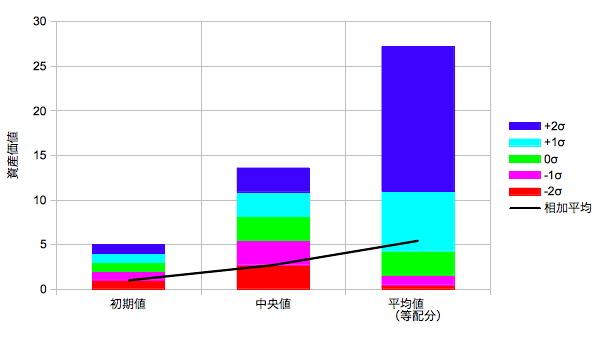 例えば-2σは初期値よりだいぶ小さくなってしまうが+2σなどが爆上げしてくれるので全体の相加平均は中央値より大きくなる、というイメージです。ただしこれはあくまでイメージであって、正確には資産価値に確率密度が乗算されるので+2σがそのまま効いてくるわけではないという認識です(対数正規分布の確率密度は資産価値が高くなるほど粗になるため、例えば±2σの組が確率的に対で存在するわけではない)。