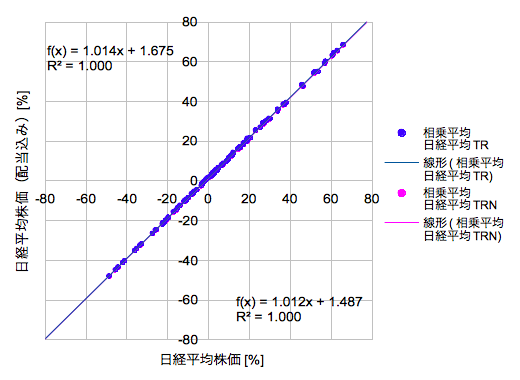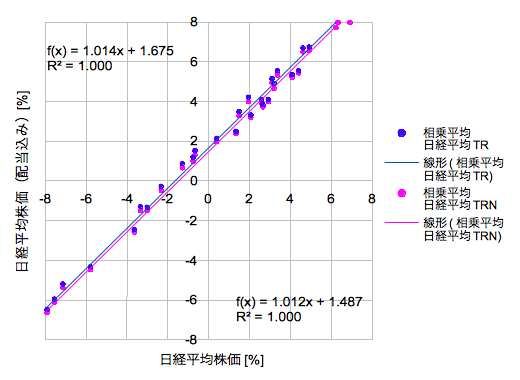 【日経平均株価の配当ありなしの相関(全体)】