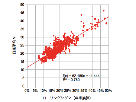 ボラティリティ指数は変動の大きさを表すある種の「微分量」であると考えています。端的には標準偏差シグマで代表できる量ではないかと考えています。ということで日経平均株価のローリングシグマとボラティリティインデックスとの相関を確認しておきたいと思います。