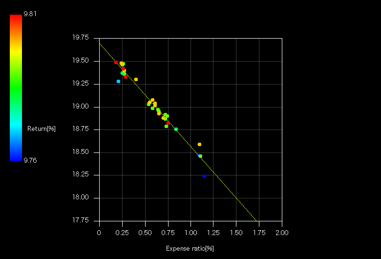 ほぼ傾き-1のきれいな相関です。為替換算リスクがある割にバラツキも1σで0.06%程度と小さいです。横軸のバラツキ幅が1%くらいあるのでコストと実績との関係が顕著に見えてきます。