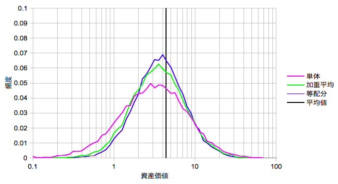 まず横軸を1dB(デシベル)ごとの対数で表した頻度分布において等配分、加重平均とも分布が左右対称に見えます。そして両者とも分布の形状が単体より狭くなっています。等配分は2個の加算平均であるため分布のシグマが「1/√2倍」されたと考えることができます。また加重平均も等配分ほどではないが分散がされているため、例えば「1/√1.5倍」のような効き方でシグマ低減されたと考えることができます(どちらも合成リスクをn年後の複利確率に置き換えたものと言える)。