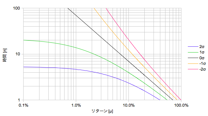 もはや72でも何でもなく気軽に使えるような式ではありませんが、一応形にはなりました。例えばσに適当な値を入れ、aを-1にすれば-1σの確率(100-16=84%)で2倍になる時間とリターンとの関係がわかります(aは累積確率に相当するので2倍になる確率はその反対側、1から引いた値になります)。グラフを描くと以下のようになります。