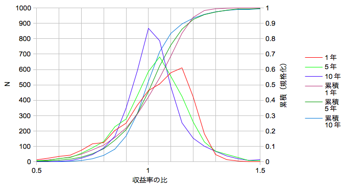 リファレンスに対する比の観点から見ると短いスパンであるほど中央値はやや大きくなるようです。ただし分布の両端の収束の仕方は短周期はあまり芳しくありません。