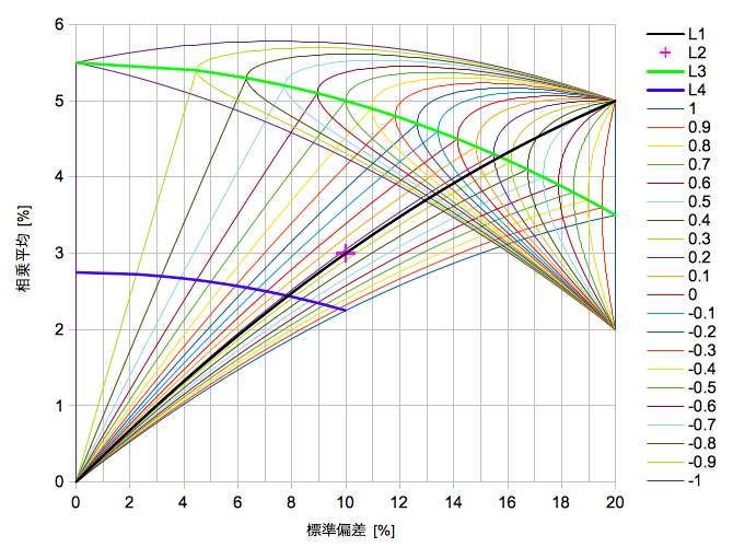 資産1(σ1=20%、r1=7%、g1=5%)、資産2(σ2=10%、r2=4%、g2=3.5%)の相関係数ごとの均等配分がL3、さらに現金(σ3=0%、r3=0%、g3=0%)との加重平均を原点を結ぶ線で表しています。そして資産1と現金との組み合わせがL1、その均等配分がL2となります。ここで2資産の相関がいずれの場合でも、L2と相乗平均が同等(3%)となるσはL2の10%より小さくなっています(同じリスクにするために現金比率を減らして相乗平均を向上させることができる)。