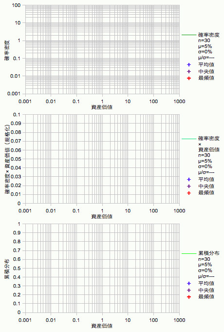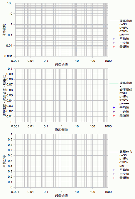 資産価値の「確率密度」「確率密度×資産価値」「累積分布」の変化をGIFのアニメーションで表現しています。「確率密度×資産価値」は数学的には時間とシグマで規格化した累積分布の微分形「d/d(資産価値)∫確率密度・d(資産価値)」です。