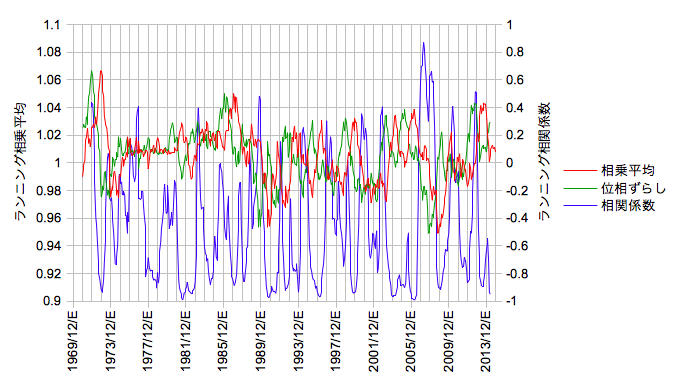 MSCI JAPANインデックス(Monthly/Gross/Local/1969/12/31-2015/05/29)から、所定の周期のランニング相乗平均とそれ自身の位相をずらしたものとの同周期のランニング相関係数を求めてみます。なおMSCI KOKUSAIインデックスも確認しましたが傾向は同様でした。