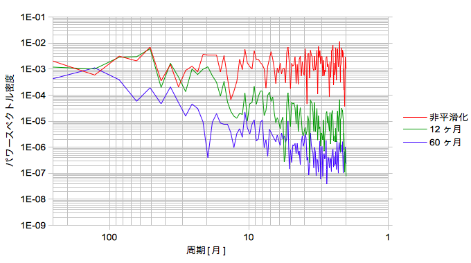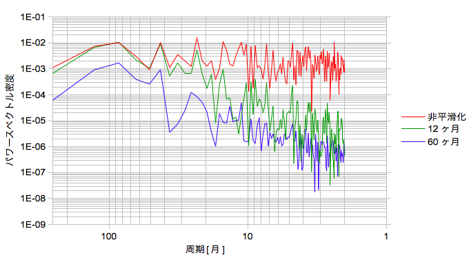 非平滑化(ローパスフィルタレス)のパワースペクトル密度の傾きがほぼ「ゼロ」であることが「変動がランダム(自己相関がゼロ)」であることを示していると考えられます(いわゆるホワイトノイズ)。また12ヶ月、60ヶ月タップのローパスフィルタはパワースペクトル密度の高周波成分が落ちることにより平滑化の作用が確認できます。どちらのフィルタも特徴的な周波数は無く、カットオフ以降の傾きはほぼ「1/f^2」です(いわゆるブラウンノイズ。物理学におけるブラウン運動のモデル)。またタップ数に応じてカットオフの位置もシフトしているように見えます。