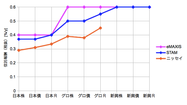 基本4資産均等配分のリスク分散特性は「リバランスボーナス」の指標で見るとそこまで良くなかったですが、実質コスト的には足を引っ張る要素が無いので使いやすいと思います。特にニッセイ4はマザーファンド(ニッセイ外国株式インデックスマザーファンド)を共有するニッセイグロ株の運用(ポートフォリオ銘柄数)が改善されているようですので、個人のアセットアロケーションの範囲内で組み込んでみてもおもしろいと思います。