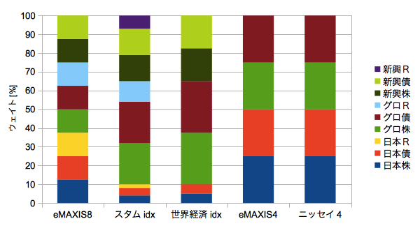 ただeMAXIS4/ニッセイ4とも信託財産留保額がありません(それぞれの単品ファンドにも設定されていない)。ゆえにeMAXIS8で0.06%程度と推定しているリバランスコストがどれほど効いてくるか興味があります。