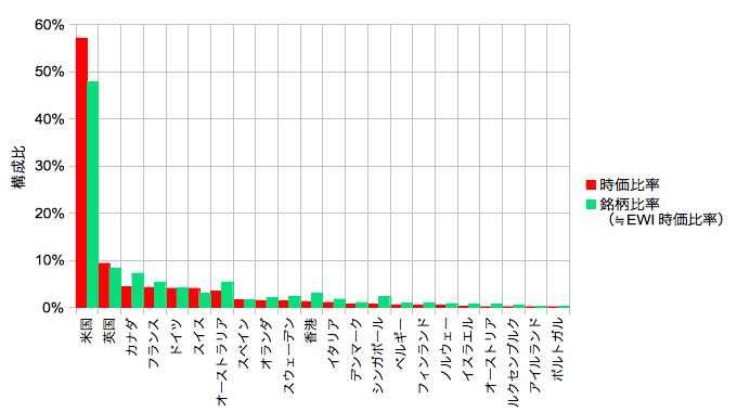 あくまで、国や通貨で色分けした時に時価配分と均等配分とで「表面上」似たような配分になるというだけで、分散(構成要素のリスク管理)という観点では時価総額比率に統計的な意味が無いことに変わりはないと考えています。