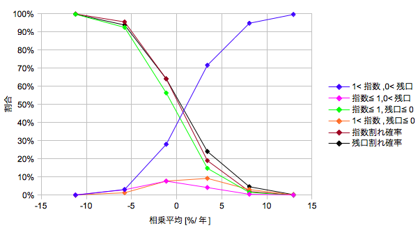 主要な演算結果である①「定額/定口」の平均値と中央値、②「定額/定口」の所定値に対する確率分布、③指数と残口数の象限確率(残存率マトリクス)について、横軸を相乗平均としてプロットします。