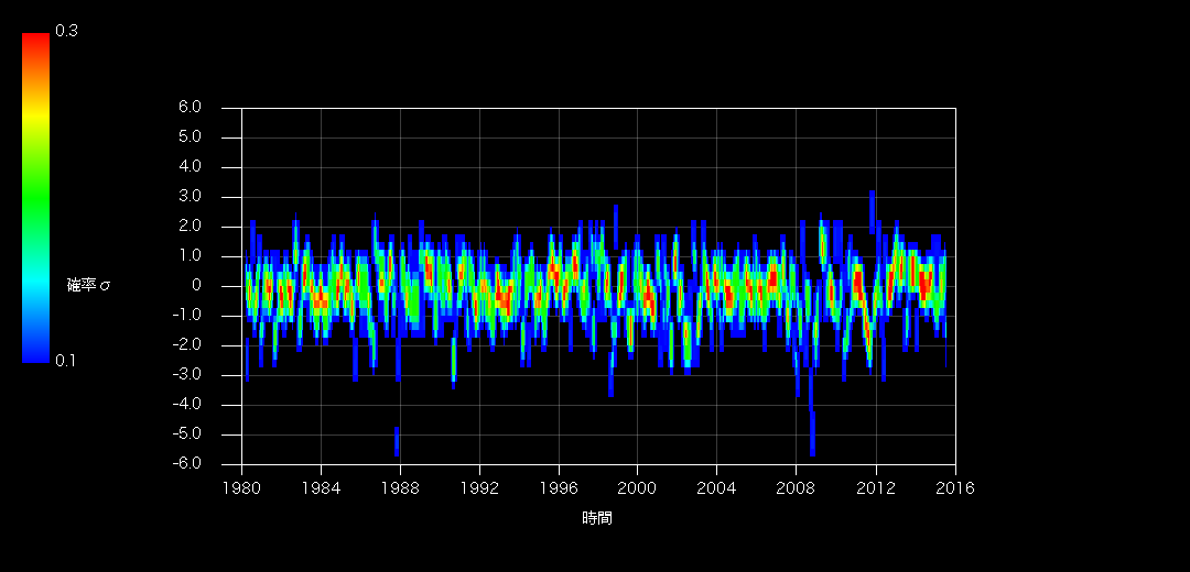 ドットの個数を二次元のアレイでカウントしてコントアで表示したものです。メッシュが粗い上にNが少ないので時系列方向に過去3ヶ月分かつ確率シグマ方向に±1タップ(3ブロック)の計9データをビンまとめし平滑化(ローパスフィルタ)を実施しています。それでも足りないのでプロッター上で短いタップのスムージングをかけています。