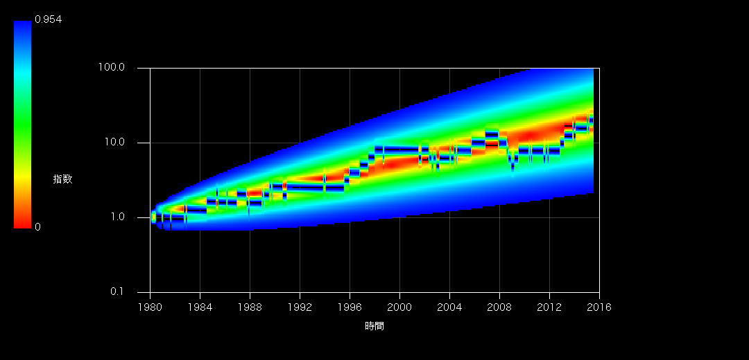 Y軸の数値を2デシベル(約1.26倍)の解像度で分解し、対応する確率振幅をZ軸としてコントアで表現したものです。実際の指数値が含まれるブロックにはY軸の値に関係なく「1」を与えています。「ドラゴンブレス」のレンジは2σ(95.4%)をとっています。そして指数を浮き彫りにするためにプロッターによるテッセレーションをかけています。