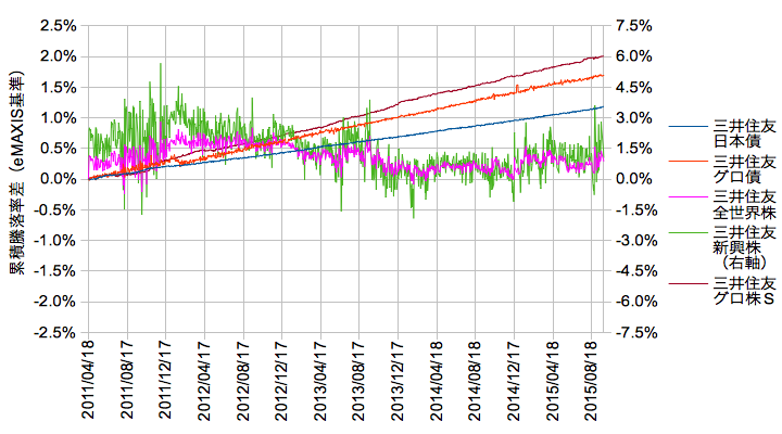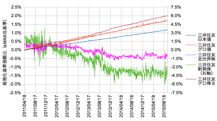 この4資産+グロ株Sを、すでにACWI追従のファンドが存在するeMAXISシリーズの基準価額に対して差分を抽出してみます。データはMorningstarより2011/04/18から2015/09/25まで。分配金はどちらも出ていません。※新興株のみ右軸で3倍スケールになっていますのでご注意願います。