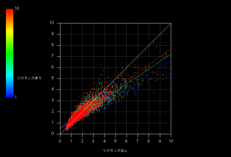 リファレンスに対する分布を確認します。まず横軸にリファレンス、縦軸にリバランスとして資産総額の相関プロットを示します。Z軸(カラー)には平準化の周期を取っています。色のついた線は直線近似、白い線は1:1対応を表します。