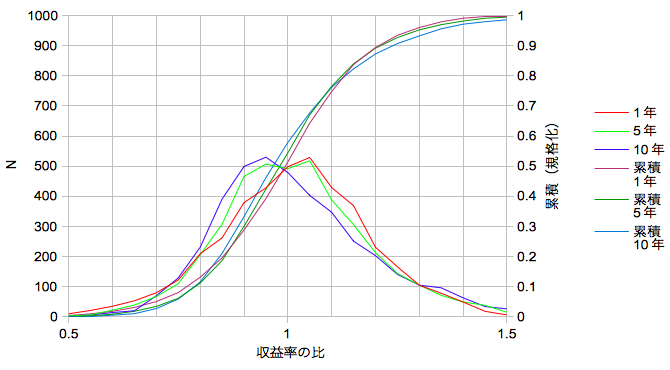 周期が長いほど収益率の比が大きい部分の確率が高くなるようですが、逆に中央値は低くなることがわかります。