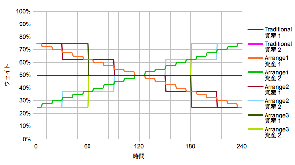 全体の期間を20年とし、2資産のリバランスでリスクの高い方のウェイトを減らし、リスクの低い方のウェイトを増やす。図示すると以下のようになります。リファレンスは等分スタートでリバランスなしとし、積立もしないとします。