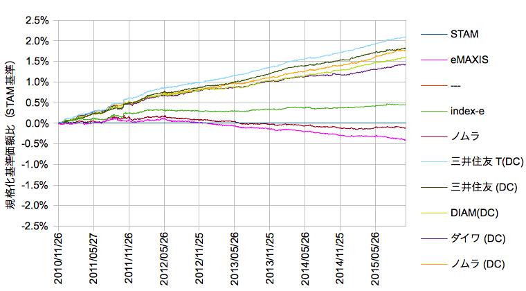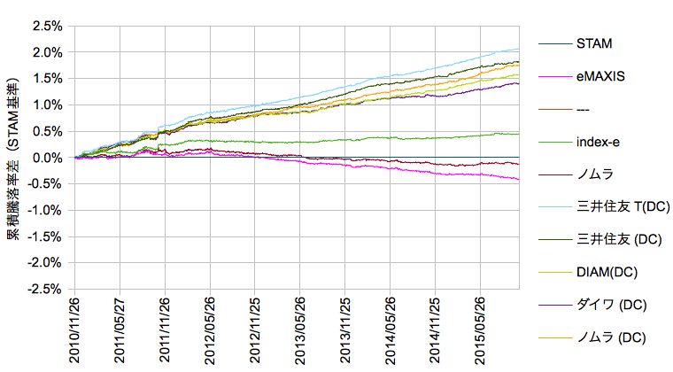 データはMorningstar Japanから、2010/11/26-2015/10/30、分配は非課税再投資で、スタムを軸に基準価額の差分を抽出します。