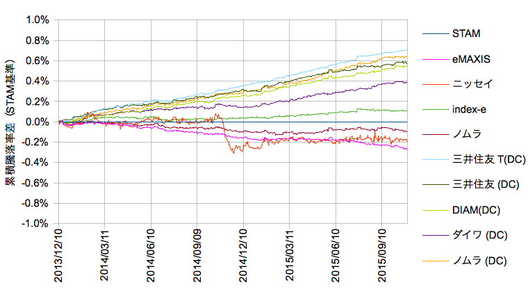 ニッセイはズッコケの影響があるので値はぶっとんでいます。2015年3月頃までに銘柄数が他と同等程度(〜1300)になったようなのでその後の推移はコスト差が現れると思っていたらあまりそのような傾向は無いようです。運用管理費用の違いが戦力の決定的差ではないということを教えてくれます。個人的には銘柄数が同程度になってもギザギザ(スタムとの差の高周波成分)が変わらないのが気になるところです。