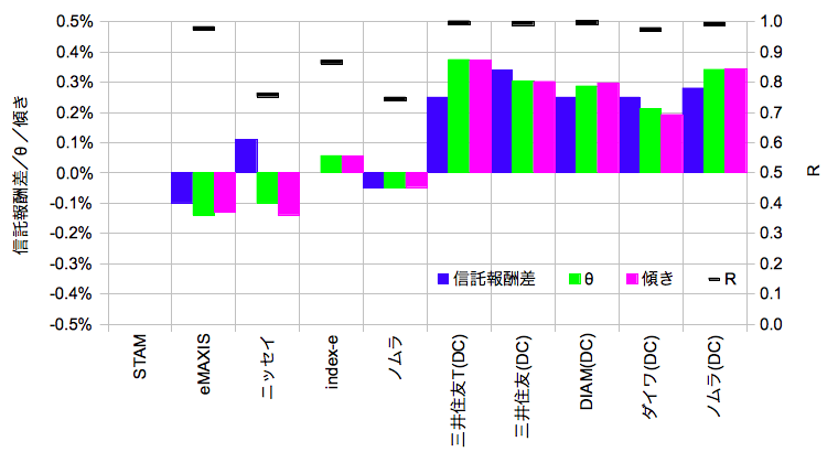 「信託報酬差」はスタムとの運用管理費用の差分(@2015/10/30)、「θ」は「arctan(規格化基準価額比@2015/10/30)」であり、この場合のθ(ラジアン)は微小なので単位時間あたりの規格化基準価額比に近似できると考えます。「傾き」は規格化基準価額比の線型近似のスロープ、「R」は線型近似の相関係数です。「θ」「傾き」は365を掛けて年単位に規格化し「信託報酬差」と次元を合わせています。