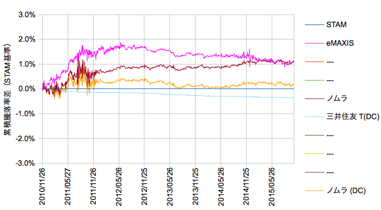 データはMorningstar Japanから、2010/11/26-2015/10/30、分配は非課税再投資で、スタムを軸に基準価額の差分を抽出します。