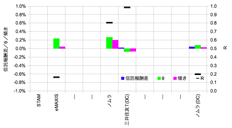 「信託報酬差」はスタムとの運用管理費用の差分(@2015/10/30)、「θ」は「arctan(規格化基準価額比@2015/10/30)」であり、この場合のθ(ラジアン)は微小なので単位時間あたりの規格化基準価額比に近似できると考えます。「傾き」は規格化基準価額比の線型近似のスロープ、「R」は線型近似の相関係数です。「θ」「傾き」は365を掛けて年単位に規格化し「信託報酬差」と次元を合わせています。